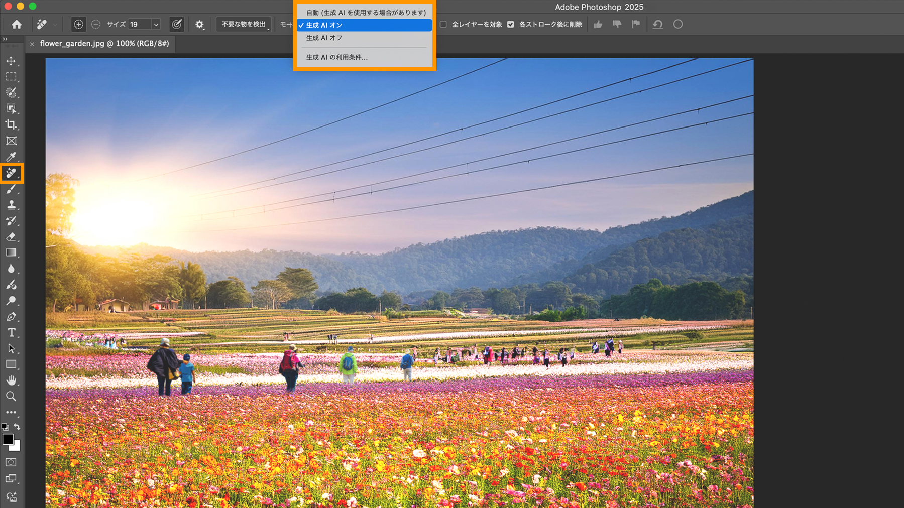 削除ツールでは、生成AIを使用するかしないかなど、異なる3つのモードを選択できます。ここでは、上部のオプションバーの「モード」ドロップダウンメニューから「生成AI オン」を選択します。