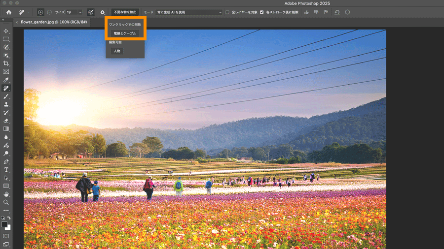 続いて、オプションバーの「不要な物を検出」ドロップダウンメニューから「電線とケーブル」をクリックします。しばらくすると写真内の電線が削除されます。