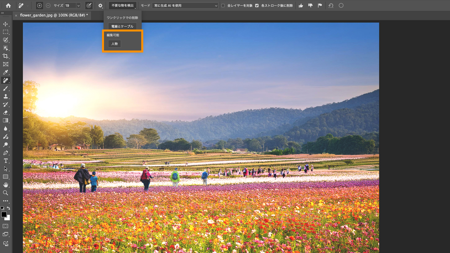 オプションバーの「不要な物を検出」ドロップダウンメニューから「人物」をクリックします。