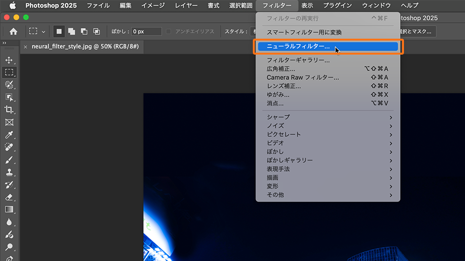 ファイルが開いたら、 フィルター / ニューラルフィルター を選択します。