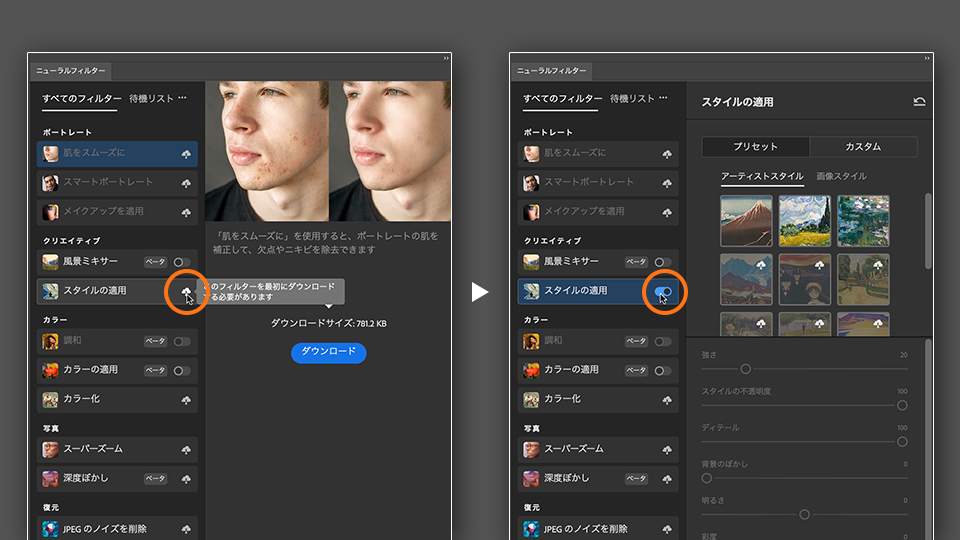 ニューラルフィルター パネルで、使⽤したいフィルターのクラウドマークをクリックしてダウンロードすると、オン/オフのスイッチに表⽰が変わります。