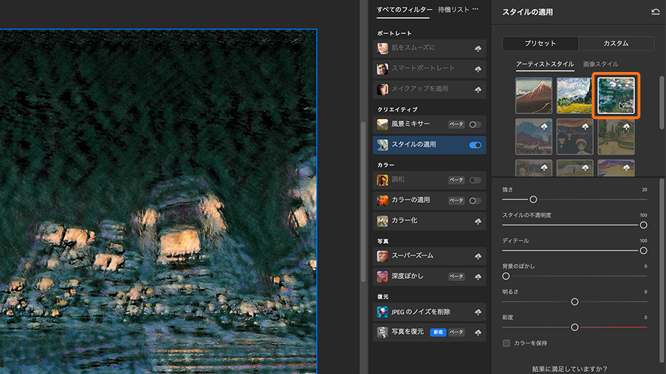 アーティストスタイル または 画像スタイル からサムネイルを選択し、さらにそれぞれの設定を細かく調整することで好みの状態に仕上げることができます。