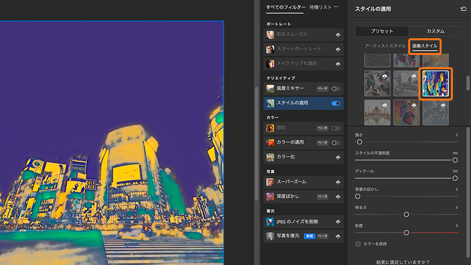 スマートフィルター: ニューラルフィルターによって⽣成されたピクセルが、スマートフィルターとして出⼒されます。