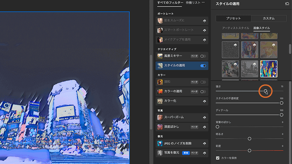 パネル下部に調整⽤のスライダーが表⽰されます。これらを使って、適⽤したスタイルをさらに調整することができます。いくつか試してみましょう。