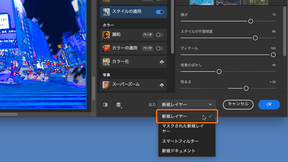 新規レイヤー: ニューラルフィルターによって⽣成されたピクセルのみ、新規レイヤーとして出⼒されます。