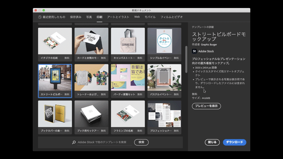 ここでは「ストリートビルボードモックアップ」というテンプレートを選択し、右のパネルで「プレビューを表⽰」をクリックします。