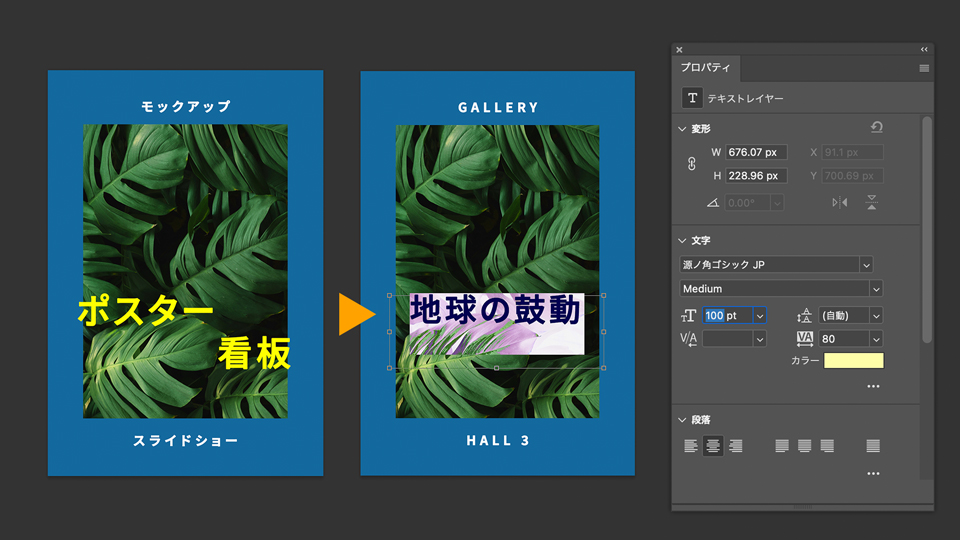 画像の調整が終わったら、3つのテキストレイヤーをそれぞれ選択し、⽂字ツールを使って既存のテキストの上から好きな⽂字を⼊⼒し直します。