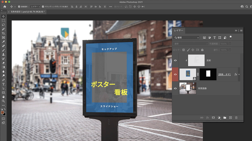 今回はビルボードフレーム内のポスターデザインを編集するため、上から2つ⽬のレイヤーを選択します。
