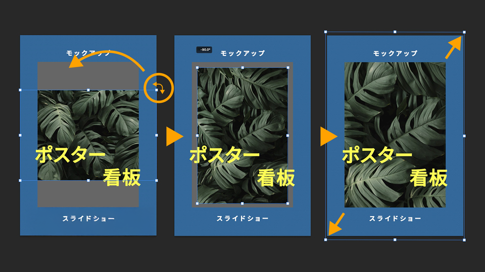 新たに追加された画像レイヤーを選択します。バウンディングボックスの右上のコーナー付近にマウスポインターを合わせて、回転のマークに変わったらShiftキーを押しながら左⽅向に-90°回転させます。