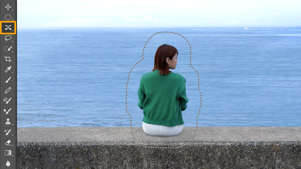 ツールパネルから「コンテンツに応じた移動ツール」を選んで、Shiftキーを押しながら被写体を左に「600px」移動します。マウスを離すと移動が完了し、元いた場所は周囲と馴染むように⾃動的に塗りつぶされます。