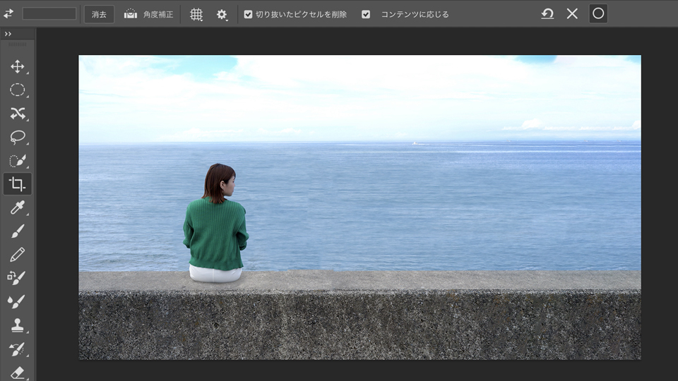 ツールパネルから「切り抜きツール」を選びます。写真の周囲に切り抜き境界線が表⽰されます。