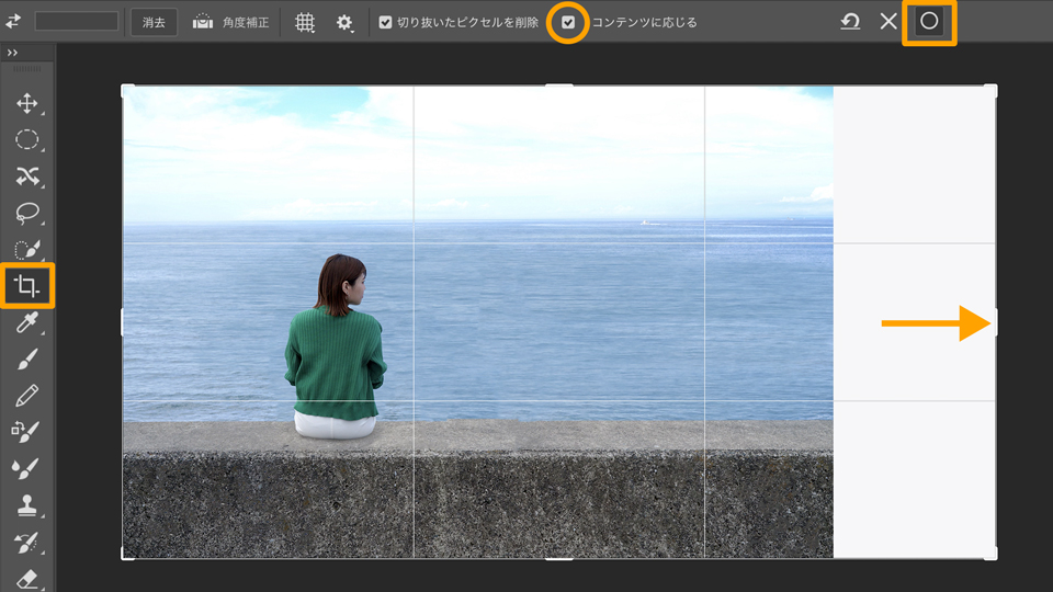 オプションバーの「コンテンツに応じる」オプションを有効にし、右側にある◯ボタンをクリックします。