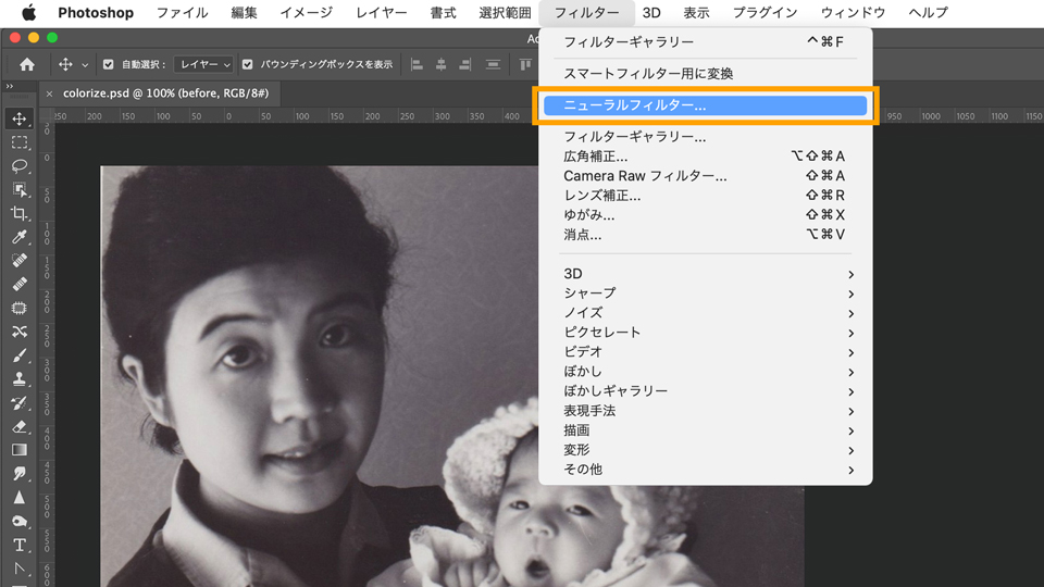 ファイルが開いたら「before」レイヤーを選択した状態で「フィルター」→「ニューラルフィルター」をクリックします。