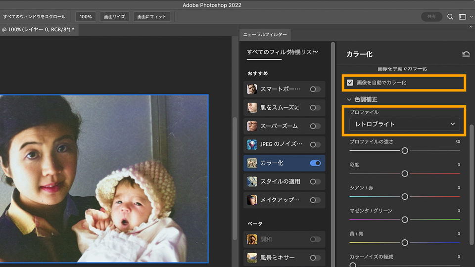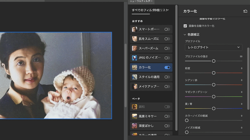 「カラー化」パネルの「画像を自動でカラー化」にチェックを入れます。「色調補正」>「プロファイル」のメニューから「レトロブライト」を選択します。