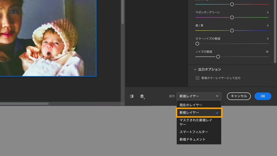 新規レイヤー :ニューラルフィルターによって生成されたピクセルのみ、新規レイヤーとして出力されます。