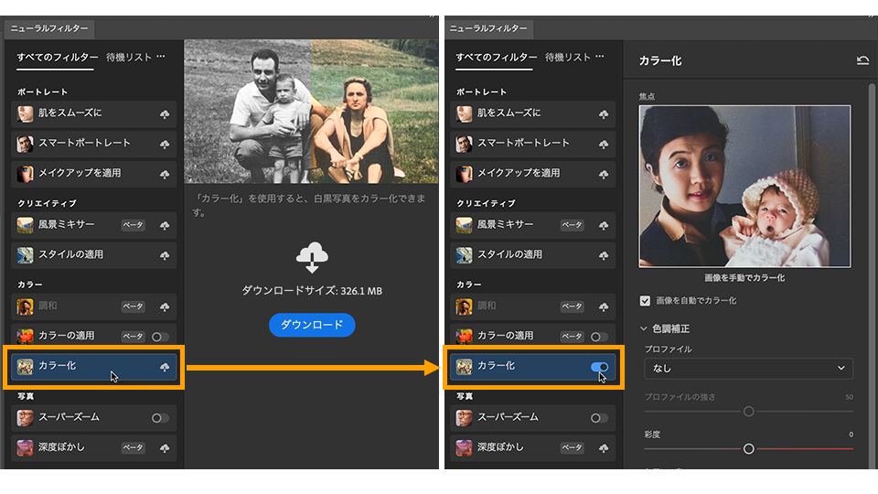 「すべてのフィルター」タブを選択し、「カラー」セクションの「カラー化」のクラウドマークをクリックしてダウンロードします。