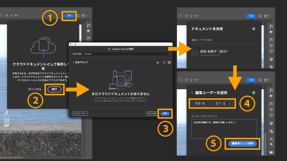 「共有」機能とPhotoshop web版を利用することで、複数人による画像の校正、修正作業を、場所や環境にとらわれず効率よく行うことができます。