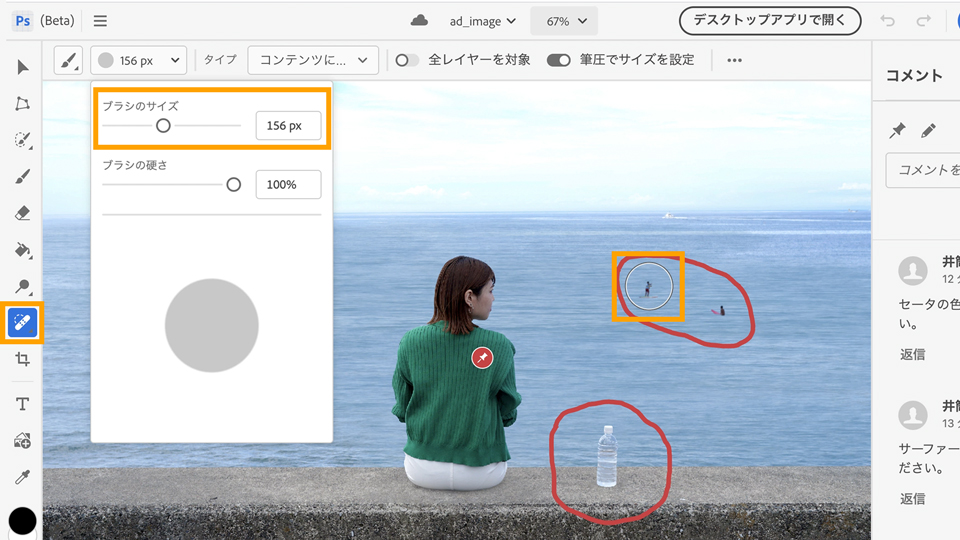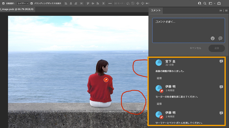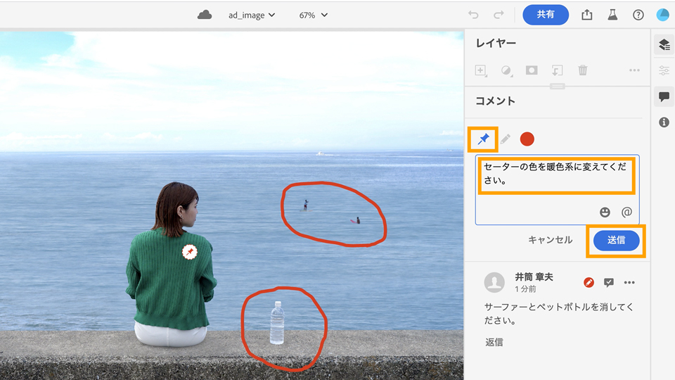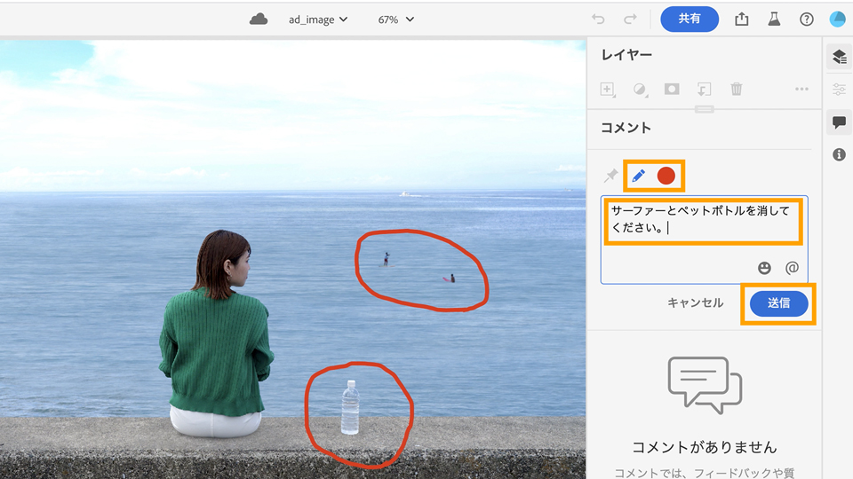 まず、画面右側の「コメント」パネルの上部にある「シェイプを描く」ツールを選択すると右側に丸いカラーが表示されるので、色を選びます。海に浮かぶサーファーと、モデルの横にあるペットボトルを囲み、削除するコメントを書き込んで「送信」ボタンをクリックします。