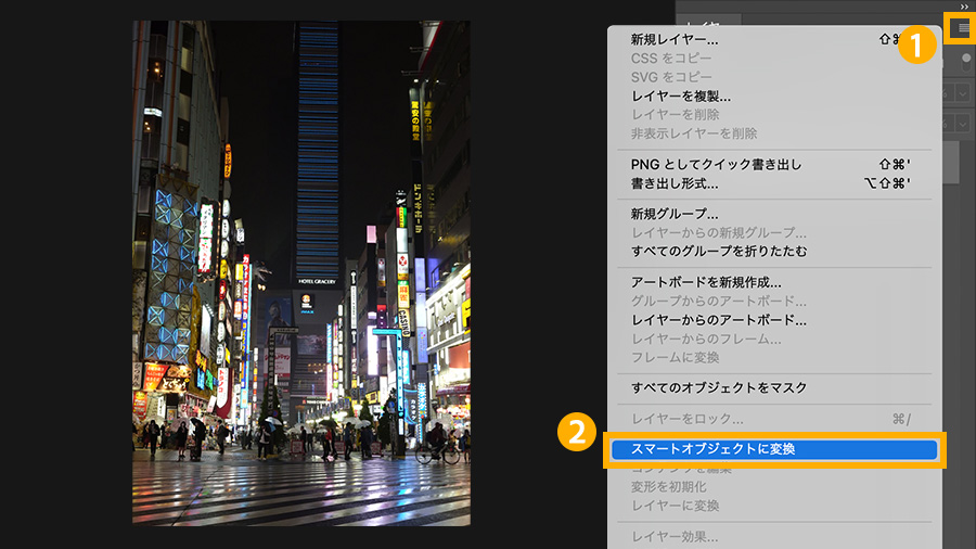 レイヤーパネルの右上にあるメニューボタンをクリック①して、「スマートオブジェクトに変換」を選択②します。これにより、元の画像を保持したまま編集を加えることができます。