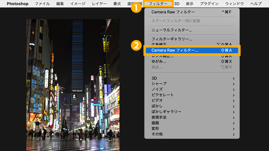 スマートオブジェクトを選択した状態で「フィルター」①>「Camera Rawフィルター」②を選択します。