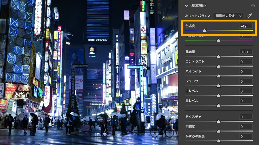 Camera Rawワークスペースが開きます。右側の編集パネルの「基本補正」を展開し、「⾊温度」を「-42」に設定して、全体的に⻘みがかった画像に調整します。