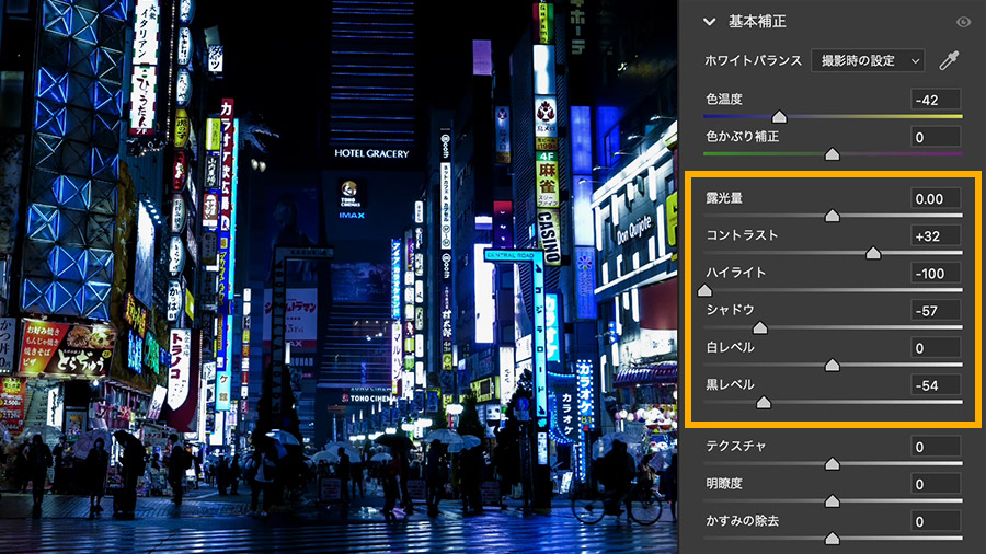 全体的に明るくもやっとしているため、「コントラスト」を「+32」、「ハイライト」を「-100」、「シャドウ」を「-57」、「黒レベル」を「-54」に設定し、明暗を強調した画像に調整します。