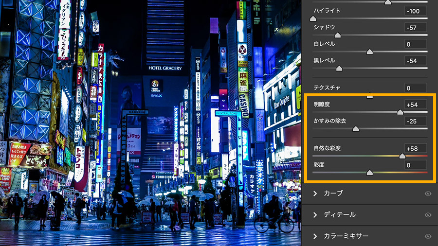 続けて「明瞭度」を「+54」、「かすみの除去」を「-25」、「⾃然な彩度」を「+58」まで上げて写真の全体像をよりくっきりとさせます。