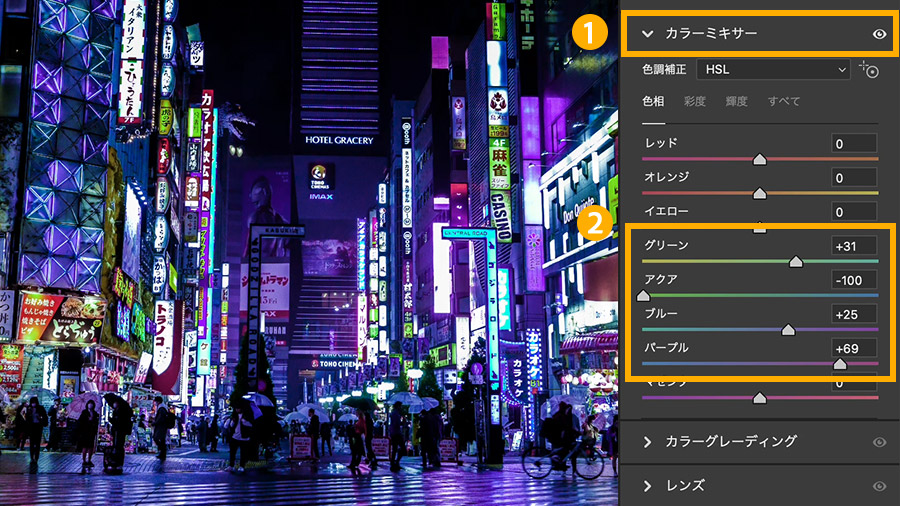 基本補正が終わったら全体の⾊味をさらに詰めていきます。「カラーミキサー」①を展開して「グリーン」を「+31」、「アクア」を「-100」、「ブルー」を「+25」、パープルを「+69」②に変更します。