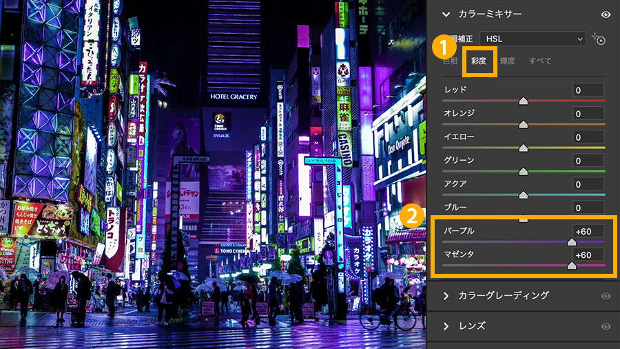 タブを「⾊相」から「彩度」①に切り替えて「パープル」を「+60」、「マゼンタ」を「+60」に設定。