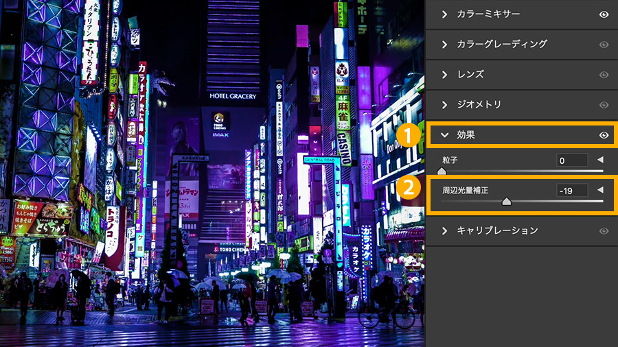 最後に「効果」①を展開して「周辺光量補正」②を「-19」に設定します。
