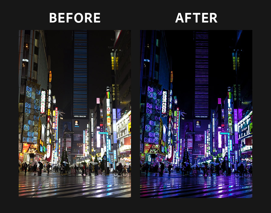PhotoshopのCamera Rawフィルターを使⽤すると、明るさ、コントラスト、カラーなどのさまざまな調整を1つのワークスペース内で⾏うことができます。このチュートリアルでは、Camera Rawフィルターを使⽤して、街の夜景写真をサイバーパンク調の画像に仕上げる⽅法を紹介します。まずは下の動画で⼀連の制作⼯程を確認しましょう。