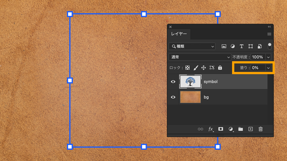 「ウィンドウ」>「レイヤー」を選択してレイヤーパネルを表⽰させます。「背景」をダブルクリックすると「新規レイヤー」ウィンドウが表⽰されるので、「bg」(バックグラウンド)と⼊⼒して「OK」をクリックします。これで「背景」が「bg」レイヤーに変換されました。次に⽊のイラストのレイヤーをダブルクリックしてレイヤー名を「symbol」と⼊⼒し、「塗り:0%」に設定します。