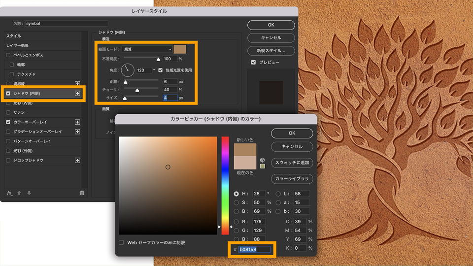 レイヤースタイル:カラーオーバーレイ、シャドウ(内側)、ベベルとエンボス
