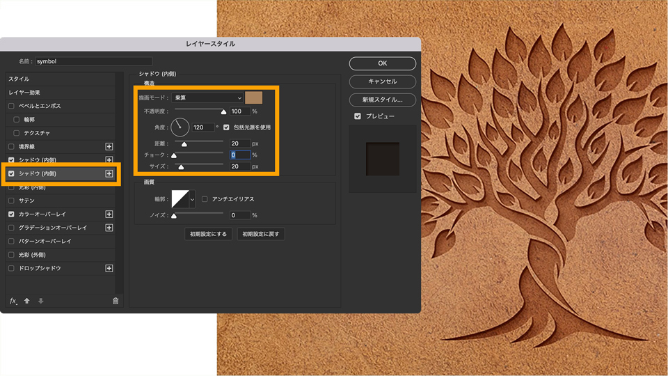 メニューのレイヤースタイル名の横に「+」があるものは、レイヤースタイルを追加して重ねることができます。「シャドウ(内側)」の横にある「+」をクリックして、以下のように設定します。