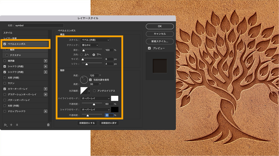 続いて「ベベルとエンボス」を選択して、以下のように設定します。