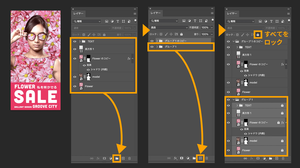 このあと、スマートオブジェクトを使って編集を⾏うため、複製元のレイヤーに影響を与えないようにロックをかけておきます。複製元のレイヤーグループ(グループ1)を展開し、含まれる全てのレイヤーを選択して、「すべてをロック」ボタンをクリックします。