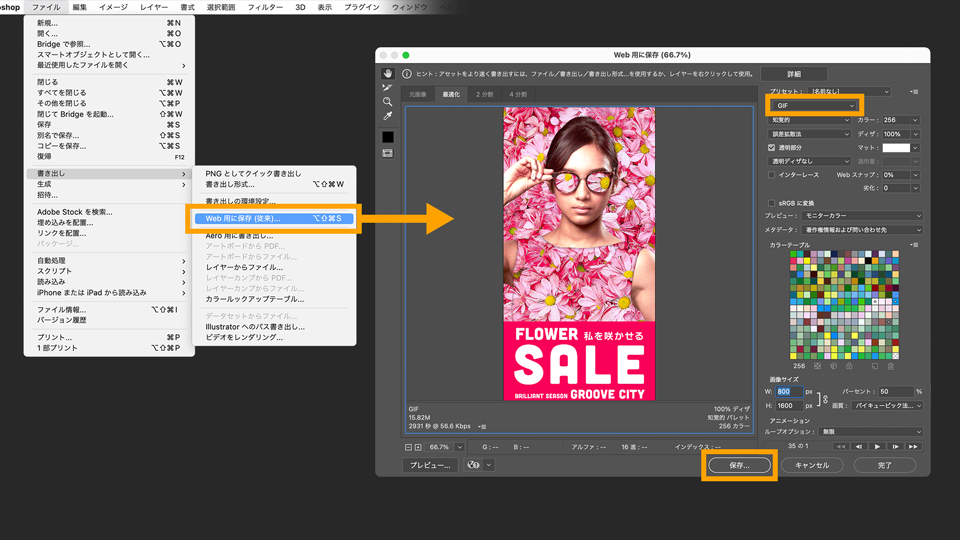 アニメーションが完成したら、「ファイル」→「書き出し」→「Web⽤に保存(従来)」を選択し、「Web⽤に保存」ウィンドウを開きます。右上のファイル形式で「GIF」を選択し、「保存」をクリックして指定の場所に保存します。