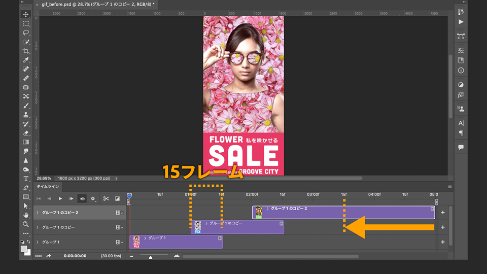 次に、真ん中のレイヤー(グループ1のコピー)の左端を30フレームまで右に、右端を75フレームまで左にドラッグします。