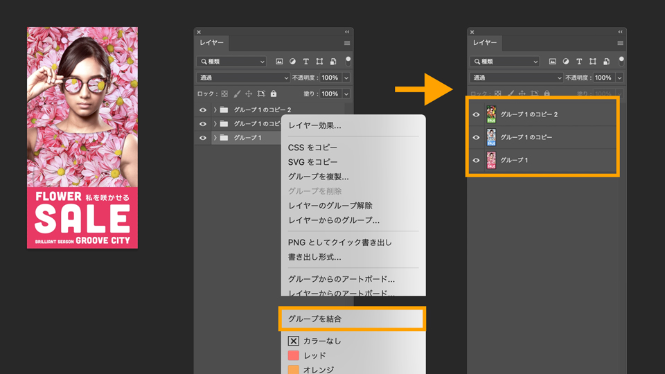 作成した3つのレイヤーグループを、それぞれ結合します。レイヤーグループを選択し、右クリックしてメニューから「グループを結合」を選択すると、1枚のレイヤーに結合されます。