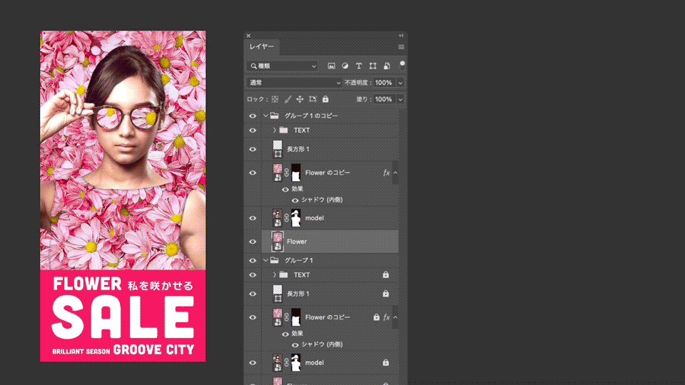 複製したレイヤーグループ(グループ1のコピー)を展開し、「Flower」レイヤーのスマートオブジェクトサムネールをダブルクリックして、スマートオブジェクトを開きます。