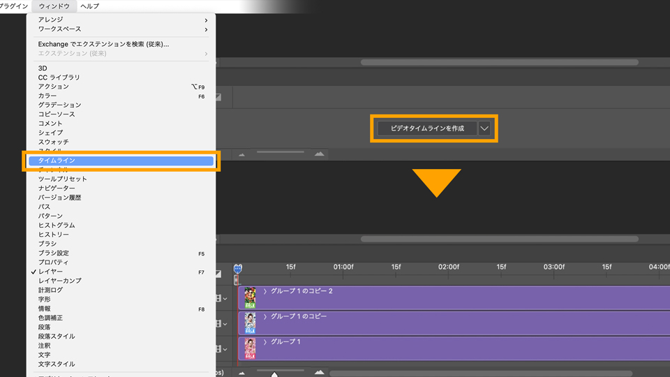 「ウィンドウ」>「タイムライン」を選択すると、「タイムライン」パネルが表⽰されます。「ビデオタイムラインを作成」をクリックすると、3つのレイヤーがビデオタイムラインに配置されます。