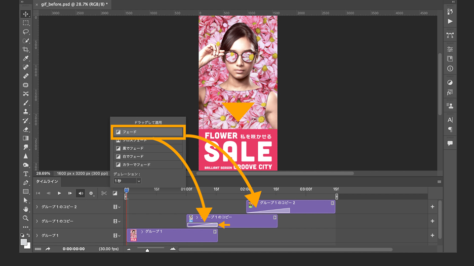 アニメーションを使った動きのある広告バナーは、静⽌画の広告よりも⽬を引きます。このチュートリアルでは、Photoshopのビデオタイムライン機能を使って、3つのレイヤー画像を切り替えて表⽰するGIFアニメーションの作り⽅をご紹介します。まずは下の動画で⼀連の制作⼯程を確認しましょう。