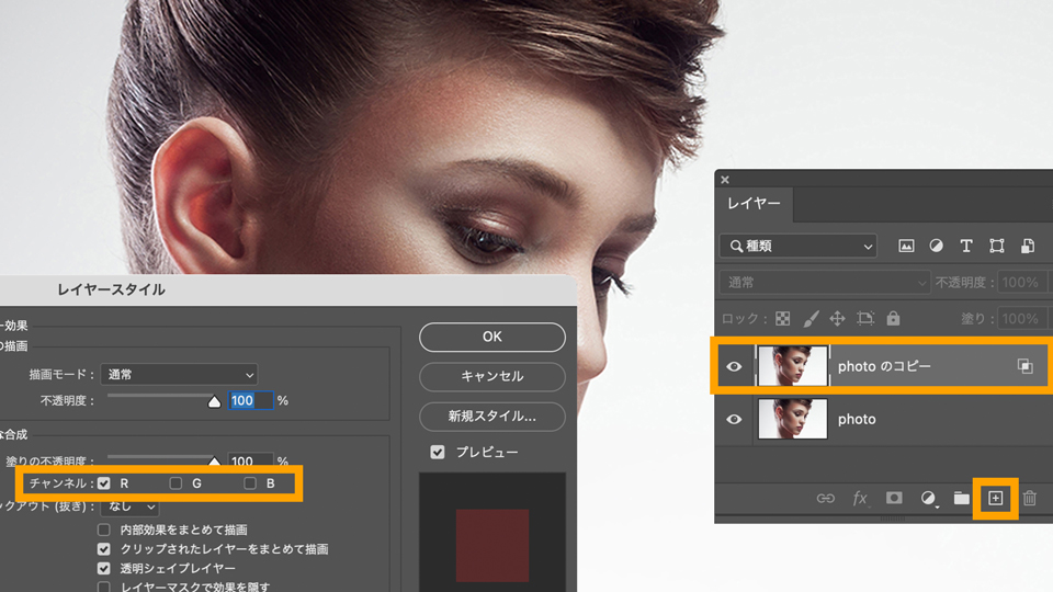 レイヤーパネルで「photo」レイヤーを選択し、パネル下部の「新規レイヤーを作成」にドラッグして複製します。続いて複製したレイヤーをダブルクリックしてレイヤースタイルウィンドウを開きます。「⾼度な合成」にあるチャンネルの「G」「B」のチェックを外し、「R」のみにチェックが⼊った状態で「OK」をクリックします。