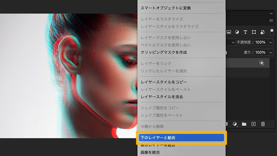 複製したレイヤーを選択し、右クリックメニューから「下のレイヤーと結合」を選び、2つのレイヤーを結合します。