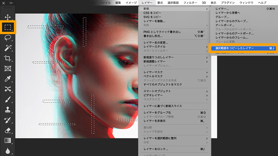 ⻑⽅形選択ツールで細⻑い選択範囲を作成し、「shift」キーを押しながら複数作成していきます。「レイヤー」>「新規」>「選択範囲をコピーしたレイヤー」を選択すると、作成した選択範囲が新規レイヤーとして⽣成されます。