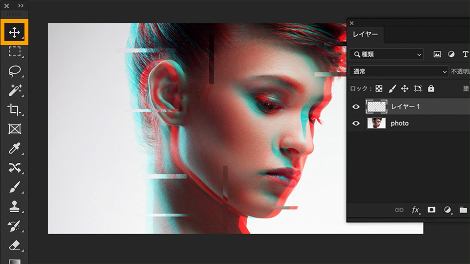 移動ツールで選択範囲のレイヤーを右下に移動して、映像の乱れを表現します。
