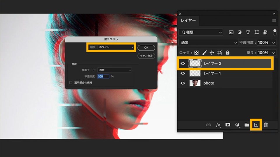 レイヤーパネル下部の「新規レイヤーを作成」をクリックして、新規レイヤーを作成します。「編集」>「塗りつぶし」を選択し、塗りつぶしダイアログボックスで内容を「ホワイト」に変更します。