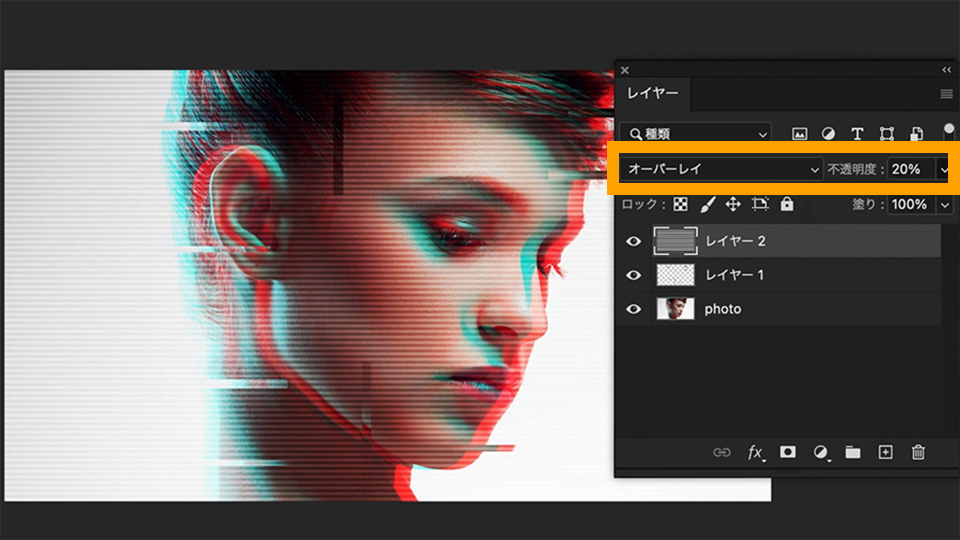 レイヤーパネルで⾛査線のレイヤーを選択した状態で、「描画モード:オーバーレイ」「不透明度:20%」に設定してなじませます。これでグリッジ加⼯の完成です。