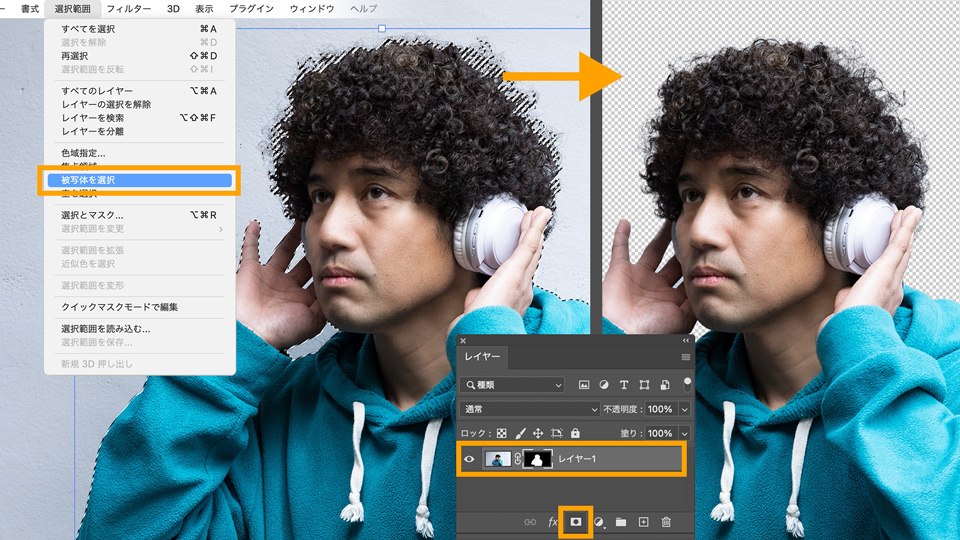 ファイルが開いたら、レイヤーパネルを開き「レイヤー1」を選択します。メニューの「選択範囲」→「被写体を選択」を選択し、レイヤーパネル下部の「レイヤーマスクを追加」アイコンをクリックすると、被写体が切り抜かれた状態になります。