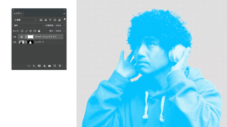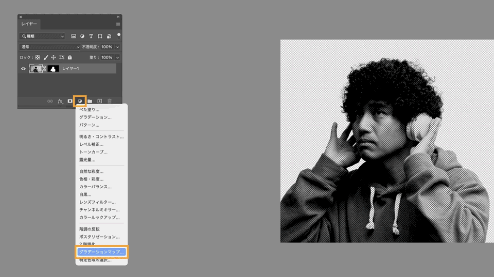 レイヤーパネルで「レイヤー1」を選択した状態で、パネル下部の「塗りつぶしまたは調整レイヤーを新規作成」アイコンをクリックし、ドロップダウンメニューから「グラデーションマップ」を選択します。
